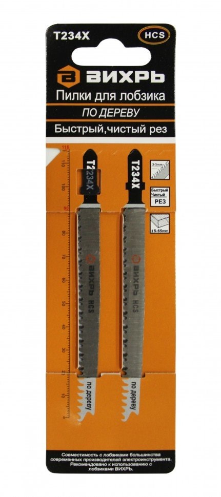 Пилки ВИХРЬ для лобзика Т234Х по дереву,быстрый,чистый рез,прогрессир.зуб 116х90мм (2 шт) 73/10/5/11