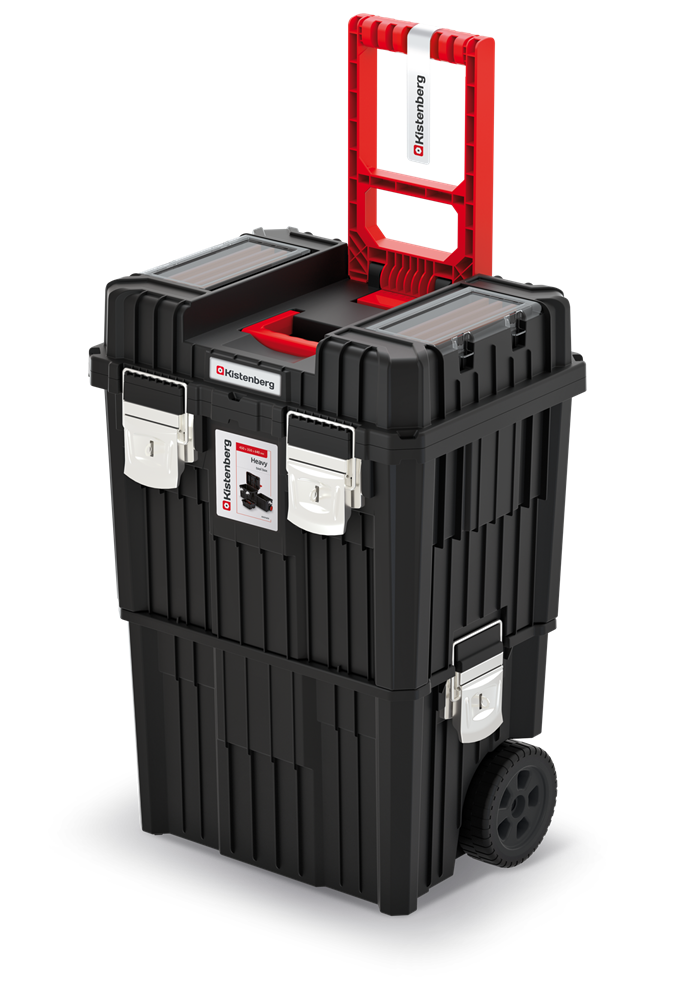 Ящик представляет собой модульную систему «3 в 1», включающую основной контейнер, переносной лоток и блок на колёсах. Конструкция оснащена органайзерами с прозрачной крышкой и отделениями для мелких деталей. Надёжные защёлки и уплотнитель защищают содержимое от пыли и влаги. Подходит для хранения и транспортировки инструментов дома, в мастерской или на строительной площадке.